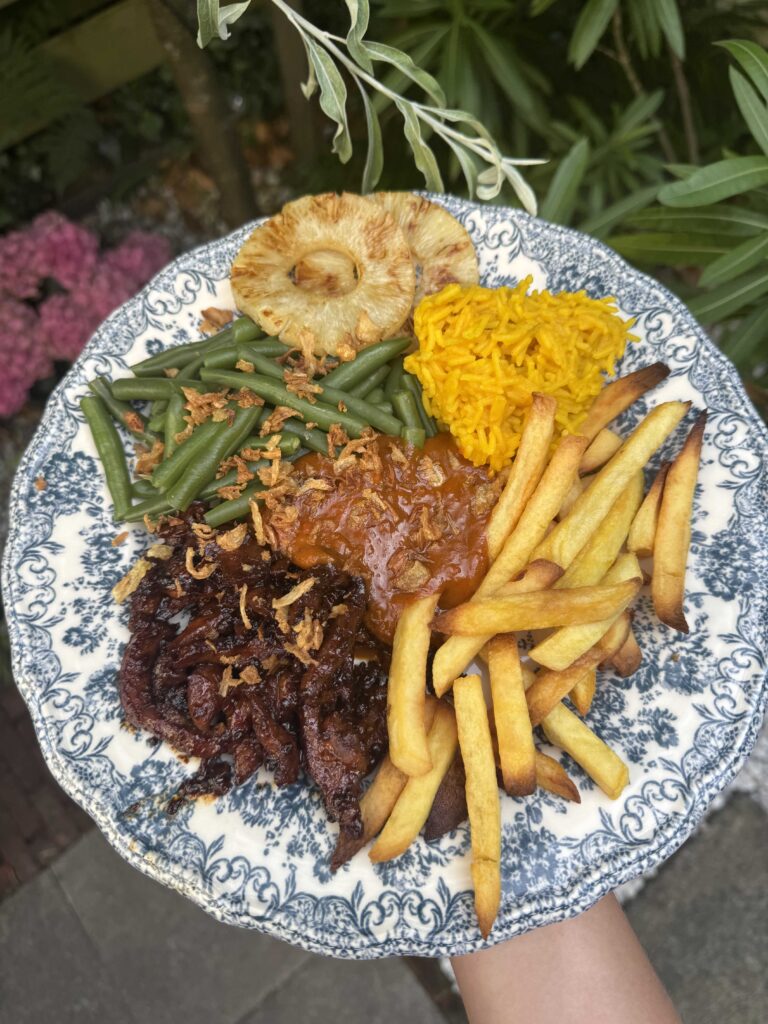 Pittige Ketjap-Saté met Gekarameliseerde Ananas en Frietjes